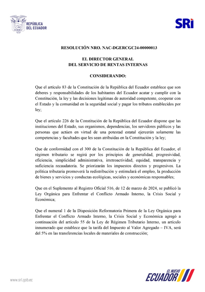 RESOLUCIÓN Nro. NAC-DGERCGC24-00000013